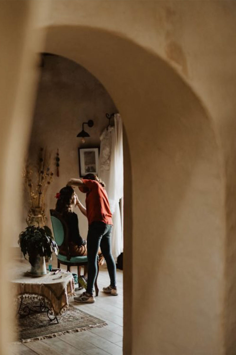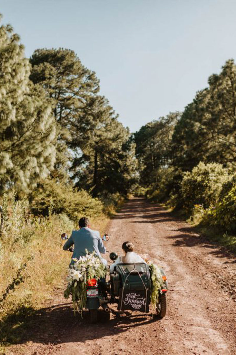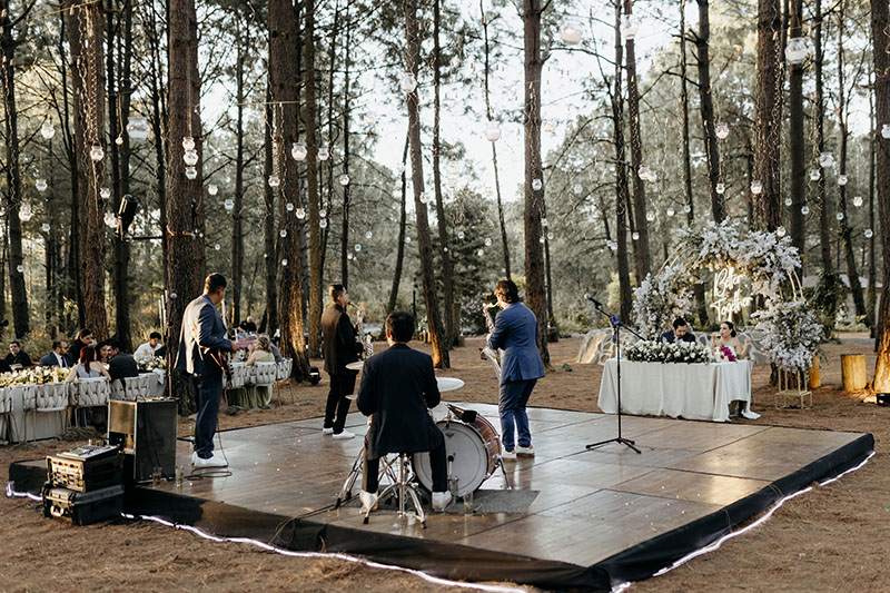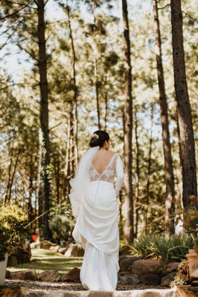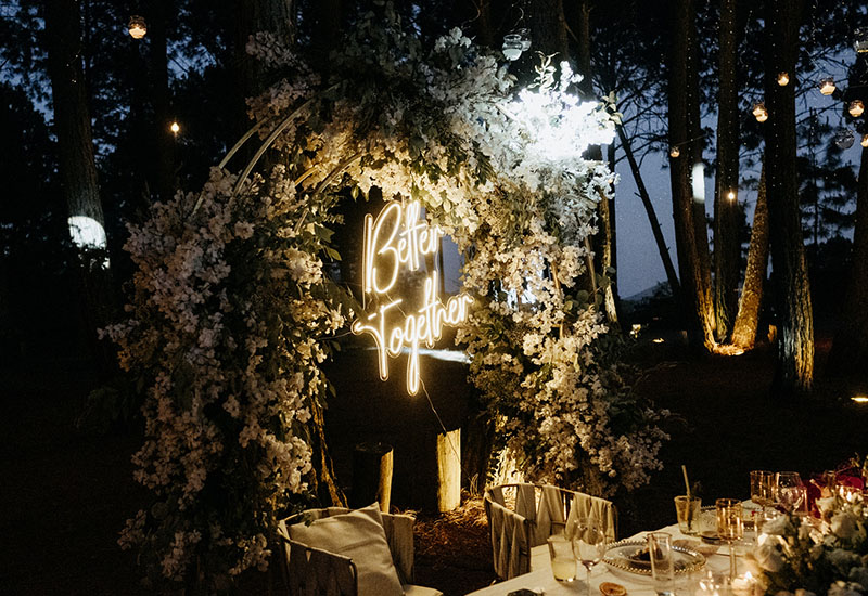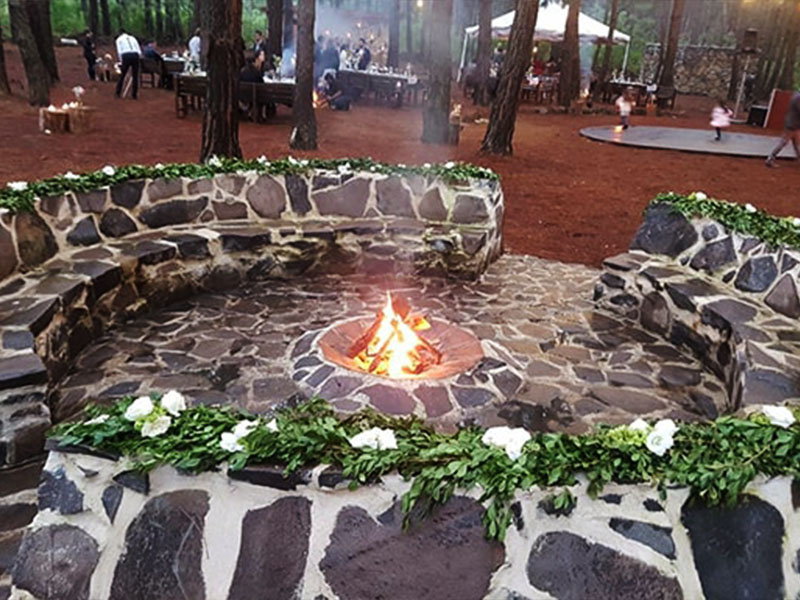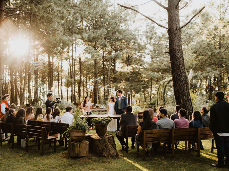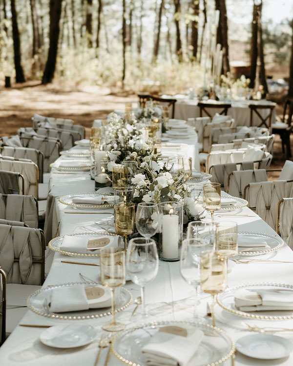 En un evento de boda en Tierra Kha, ubicado en medio del bosque, la decoración de las mesas puede combinar la elegancia natural con detalles rústicos. Se pueden usar centros de mesa hechos con flores silvestres y ramas entrelazadas, acompañados de velas en candelabros de madera tallada para una iluminación suave y romántica. Los manteles en tonos tierra o blanco roto se complementan con servilletas de lino y vajilla artesanal, creando una atmósfera íntima y en armonía con la naturaleza circundante.